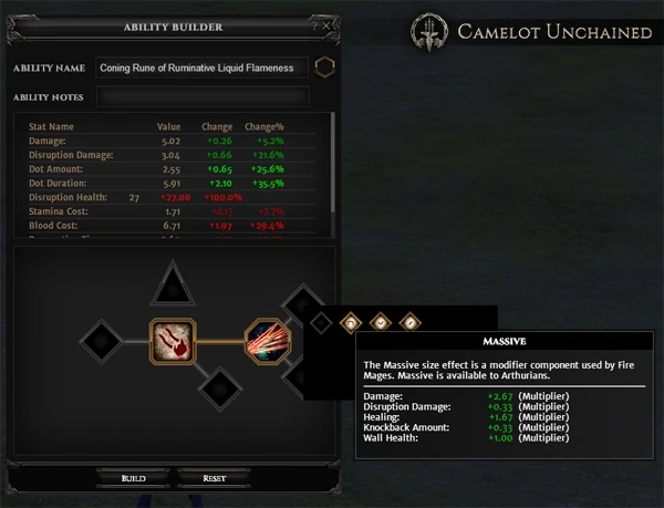 Ability Building refers to a core system of Camelot Unchained, where players create their own abilities out of components, providing them with enormous control over the way they play. Ability is used in both the Combat system and the Magic system, both as a balancing factor and to provide a way for players to increase their options and effectiveness in battle.